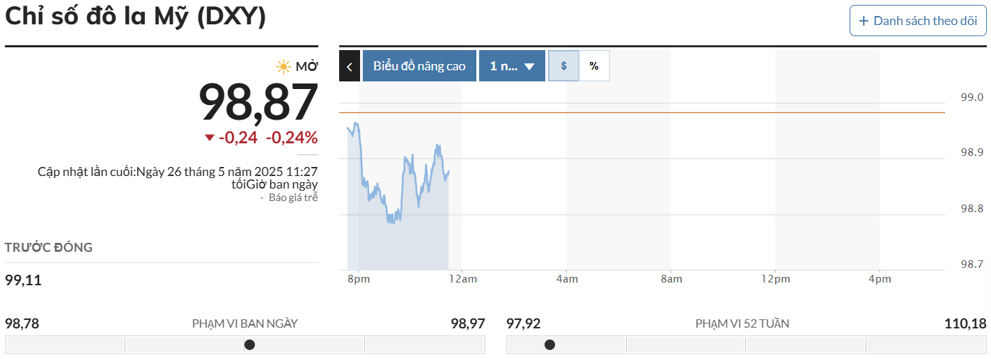 Cùng thời điểm, trên thị trường thế giới, chỉ số USD Index (DXY) - thước đo sức mạnh của đồng USD - đứng ở mức 98,97 điểm, giảm 0,23% so với phiên trước.