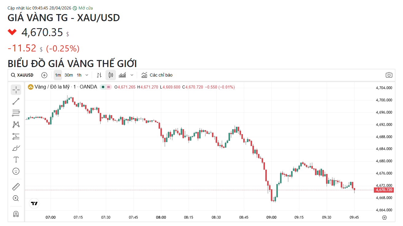 Thị trường vàng trong nước chịu áp lực từ thị trường quốc tế. Thời điểm 9h45 ngày 28/4 theo giờ Việt Nam, giá vàng thế giới giao ngay ở mức 4.670 USD/ounce, giảm 0,25% - tương ứng với mức giảm 11,52 USD/ounce so với giờ mở cửa phiên liền trước. Giá vàng thế giới quy đổi sang Việt Nam đồng hiện khoảng 148,4 triệu đồng/lượng.