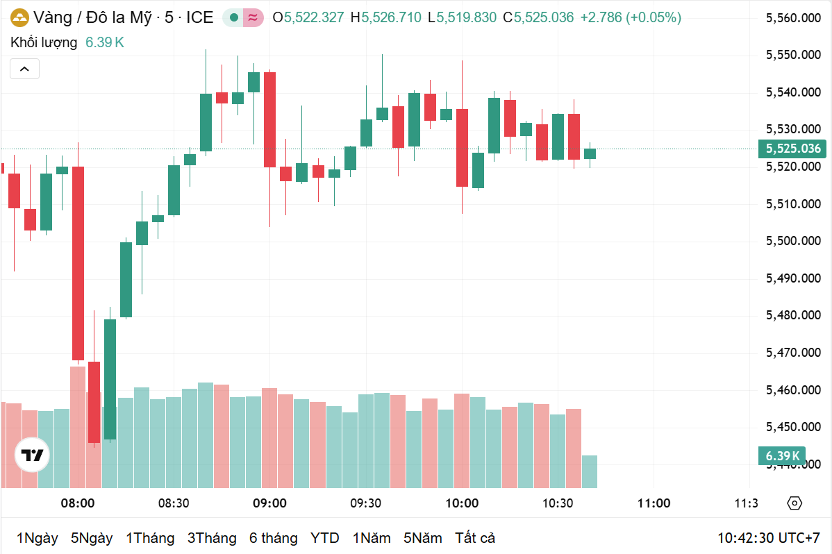 Giá vàng trong nước chưa dừng đà tăng sốc do ảnh hưởng từ giá thế giới. Thời điểm 10h00 sáng nay, theo giờ Việt Nam, giá vàng thế giới giao ngay ở mức 5.525 USD/ounce, tăng 8,66% trong 24 giờ qua, tương ứng với tăng 440,33 USD/ounce. Hiện, giá vàng thế giới quy đổi sang tiền Việt Nam đồng có giá khoảng 175 triệu đồng/lượng.
