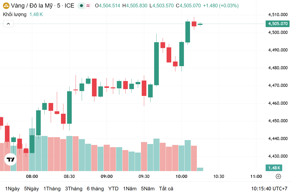 Thời điểm 9h30 theo giờ Việt Nam, giá vàng thế giới giao ngay ở mức 4.505 USD/ounce, tăng 0,32% trong 24 giờ qua, tương ứng với mức tăng 14,2 USD/ounce. Hiện, giá vàng thế giới quy đổi sang Việt Nam đồng khoảng 143,3 triệu đồng/lượng.