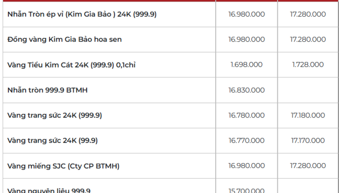 Cùng xu hướng, giá vàng nhẫn và vàng trang sức hôm nay cũng được các thương hiệu điều chỉnh giảm 1,2 - 1,4 triệu đồng/lượng ở cả hai chiều mua vào và bán ra. Cụ thể, giá mua - bán vàng nhẫn tròn trơn được Bảo Tín Minh Châu, DOJI và Phú Quý niêm yết ở mức 168,4 - 171,4 triệu đồng/lượng, tương đương giá vàng miếng; vàng nhẫn SJC niêm yết ở mức 168,2 - 171,2 triệu đồng/lượng.