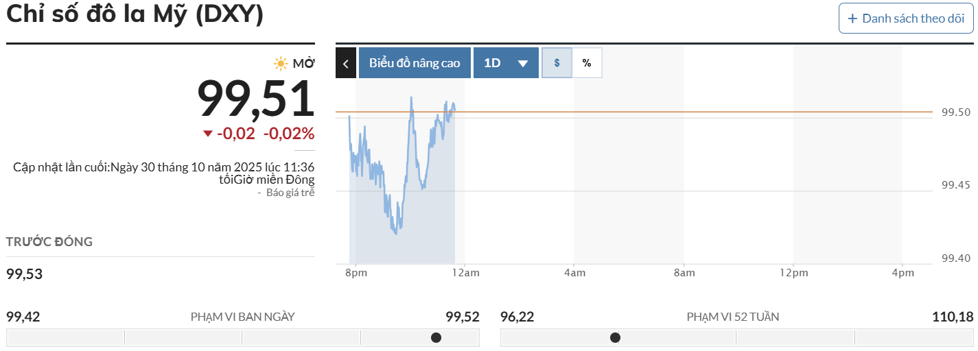 Cùng thời điểm, trên thị trường thế giới, chỉ số USD Index (DXY) - thước đo sức mạnh của đồng USD ở mức 99,51 điểm, giảm 0,02% so với phiên trước.