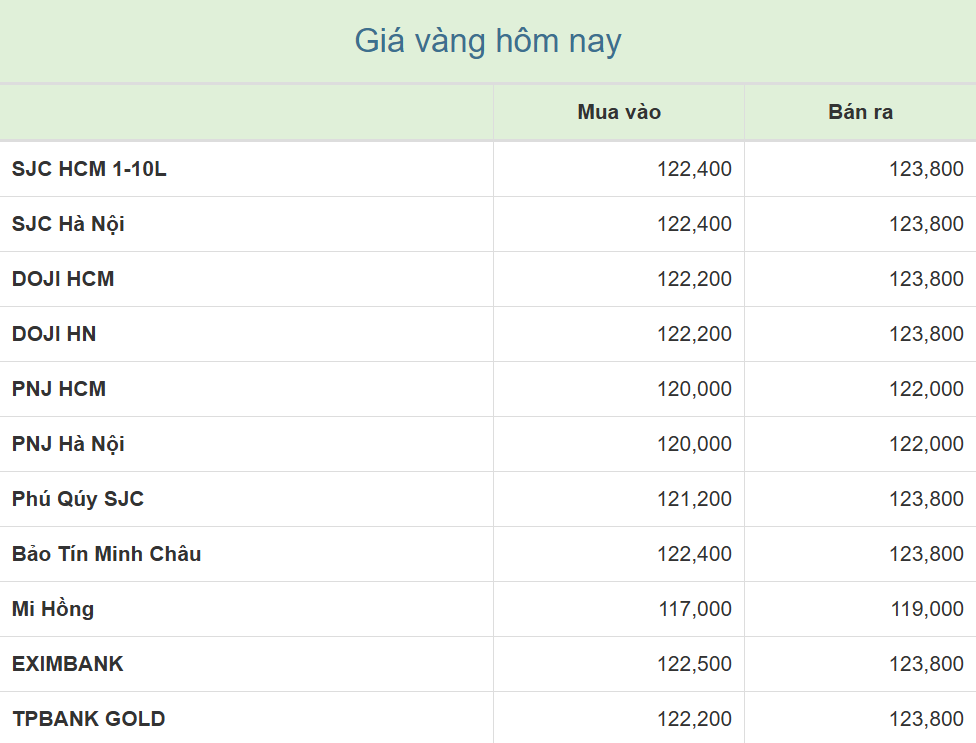Công ty Vàng bạc đá quý Sài Gòn (SJC) và Bảo Tín Minh Châu cùng niêm yết giá vàng miếng mua vào-bán ra ở mức 122,4-123,8 triệu đồng/lượng, đi ngang chiều mua - bán ra so với phiên trước.