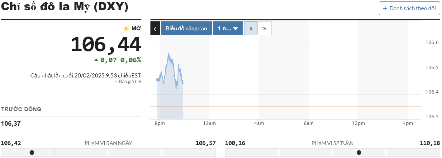 Cùng thời điểm, trên thị trường thế giới, đồng USD giảm tuần thứ 3 liên tiếp. Chỉ số USD Index (DXY) - thước đo sức mạnh của đồng USD so với các đồng tiền chủ chốt khác tăng 0,06% so với phiên liền trước, đứng ở mức 106,44 điểm.