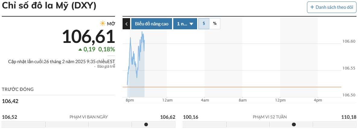 Cùng thời điểm, đồng USD tăng cao hơn do lo ngại về thuế quan. Chỉ số USD Index (DXY) - thước đo sức mạnh của đồng USD - đứng ở mức 106,61 điểm, tăng 0,18% so với phiên trước.