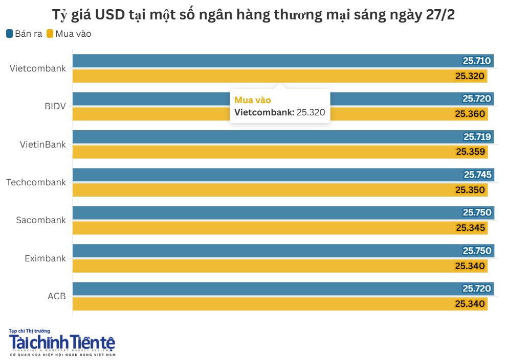 Cụ thể, lúc 9h30 phút hôm nay, tại Vietcombank, giá mua - bán đồng USD được niêm yết ở mức 25.320 - 25.710 VND/USD (mua vào - bán ra), giảm 10 đồng so với chốt phiên ngày 26/2.