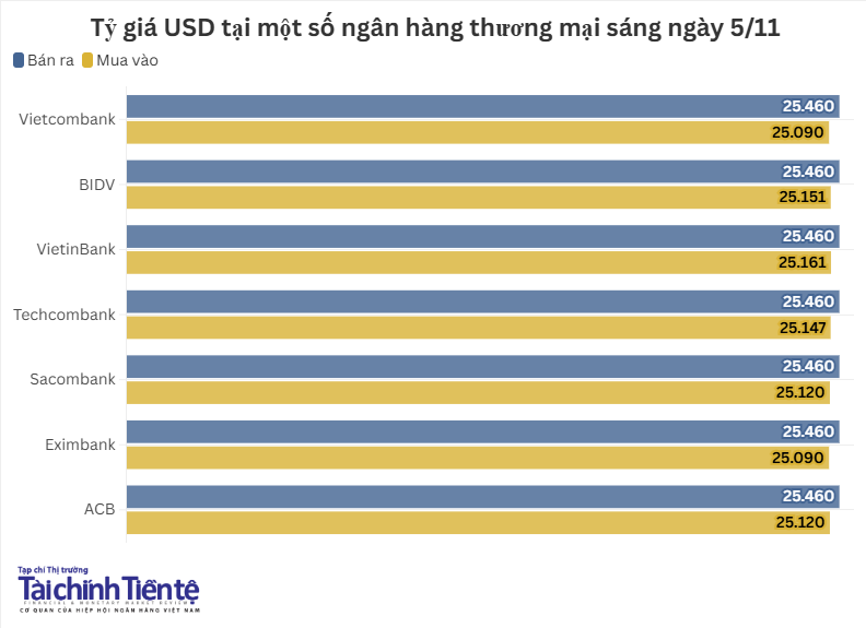 Giá mua - bán đồng bạc xanh được hầu hết các ngân hàng niêm yết ở mức 25.460 VND/USD, với diễn biến tăng/giảm đan xen từ 5 - 30 đồng so với chốt phiên cuối hôm qua (ngày 4/11).