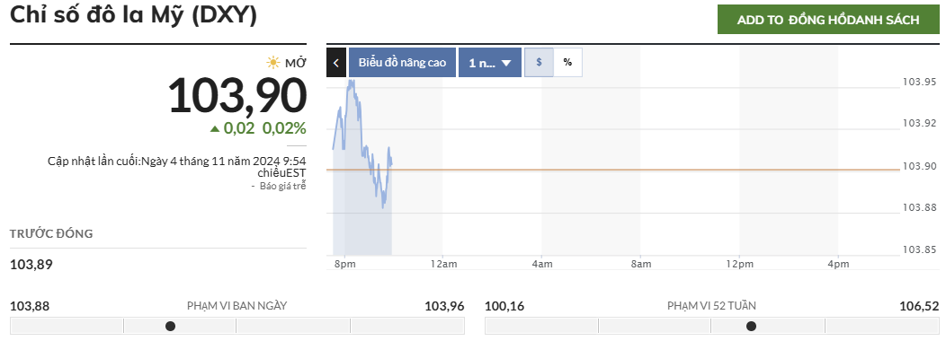 Chỉ số DXY giao dịch quanh mức 103,9 điểm, giữ nguyên mức lỗ từ phiên trước vì sự không chắc chắn về kết quả của cuộc bầu cử tổng thống Mỹ.