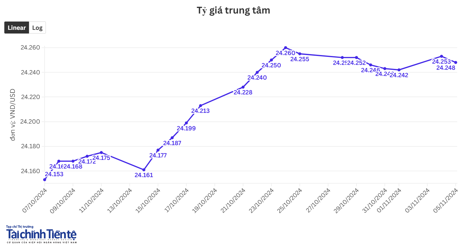 Tỷ giá trung tâm giữa đồng Việt Nam (VND) với đồng đô la Mỹ (USD) sáng ngày 5/11 được Ngân hàng Nhà nước (NHNN) công bố ở mức 24.248 đồng, giảm 5 đồng so với chốt phiên ngày 4/11.