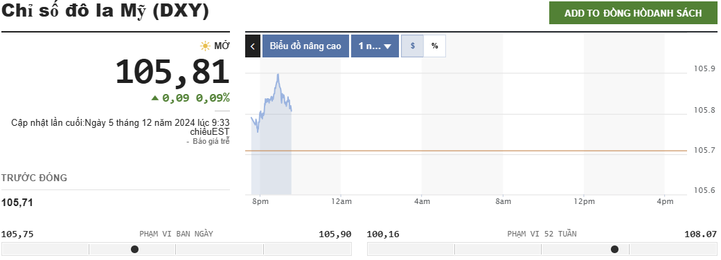Cùng thời điểm, trên thị trường thế giới, chỉ số USD Index (DXY) - thước đo sức mạnh của đồng USD so với các đồng tiền chủ chốt khác - ở mức 105,81 điểm, tăng 0,09% so với phiên trước.