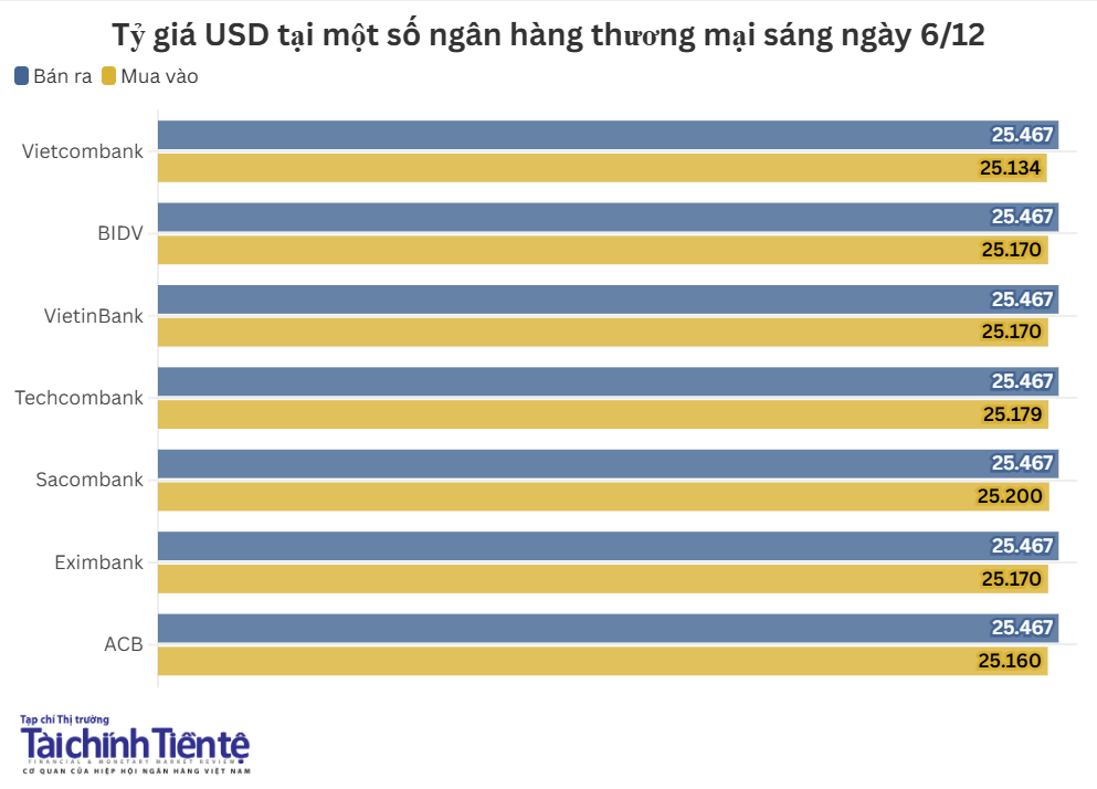 Giá mua - bán đồng bạc xanh tại các ngân hàng được điều chỉnh theo xu hướng giảm, với biên độ dao động từ 7 - 12 đồng so với chốt phiên ngày 5/12. Giá mua thấp nhất đang ở mức 25.134 VND/USD, giá mua cao nhất ở mức 25.200 VND/USD. Giá bán ra được hầu hết các ngân hàng niêm yết ở mức 25.467 VND/USD.