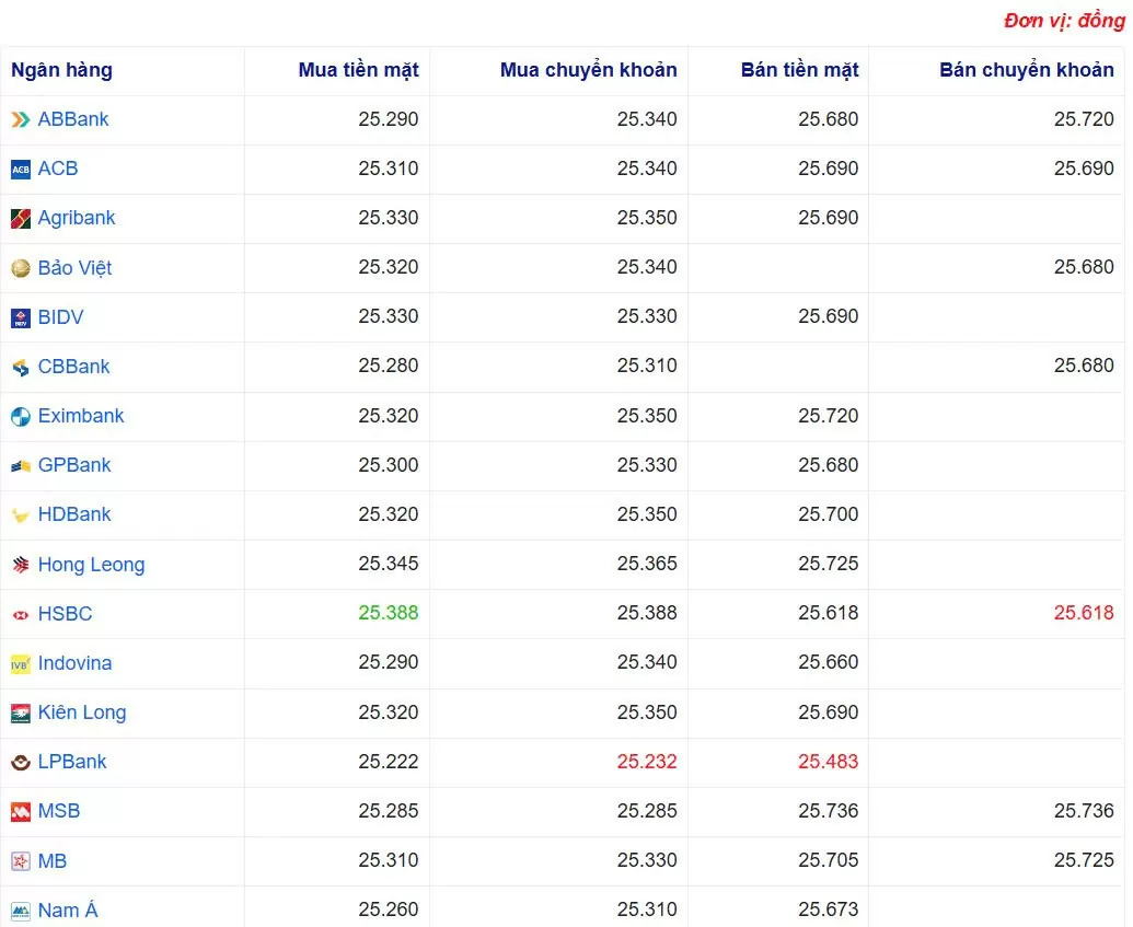 Ngân hàng HSBC đang bán chuyển khoản USD với giá thấp nhất là: 1 USD = 25.618 VND