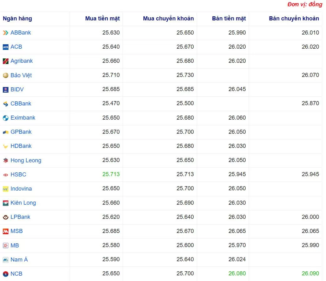 Ngân hàng HSBC đang mua tiền mặt USD với giá cao nhất là: 1 USD = 25.713 VND