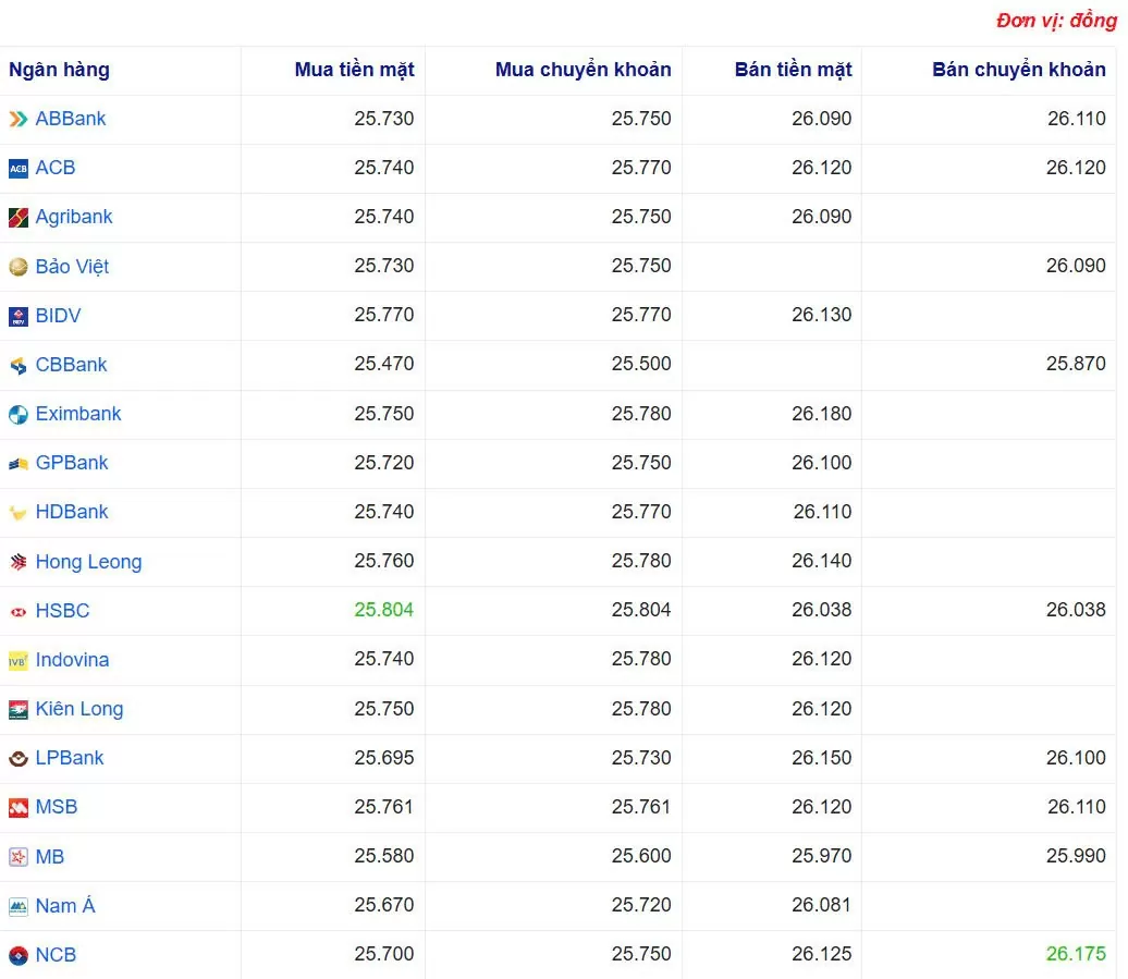 Ngân hàng HSBC đang mua tiền mặt USD với giá cao nhất là: 1 USD = 25.804 VND