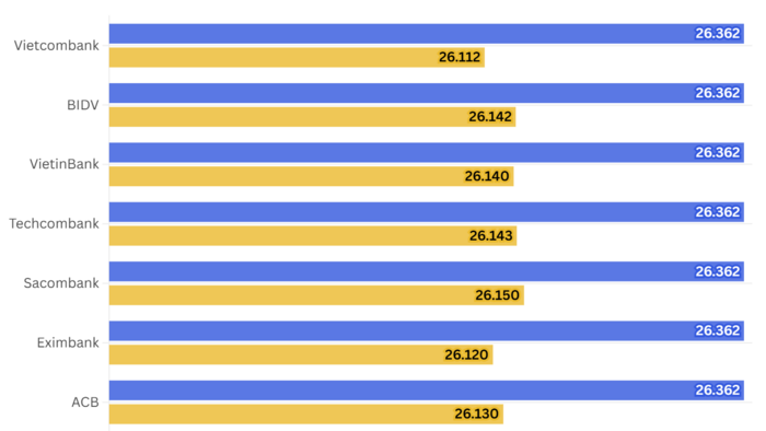 Cụ thể, tại ngân hàng Vietcombank, tỷ giá USD là 25.886 - 26.276 đồng/USD, tăng 33 đồng ở cả 2 chiều, so với phiên giao dịch ngày hôm qua.