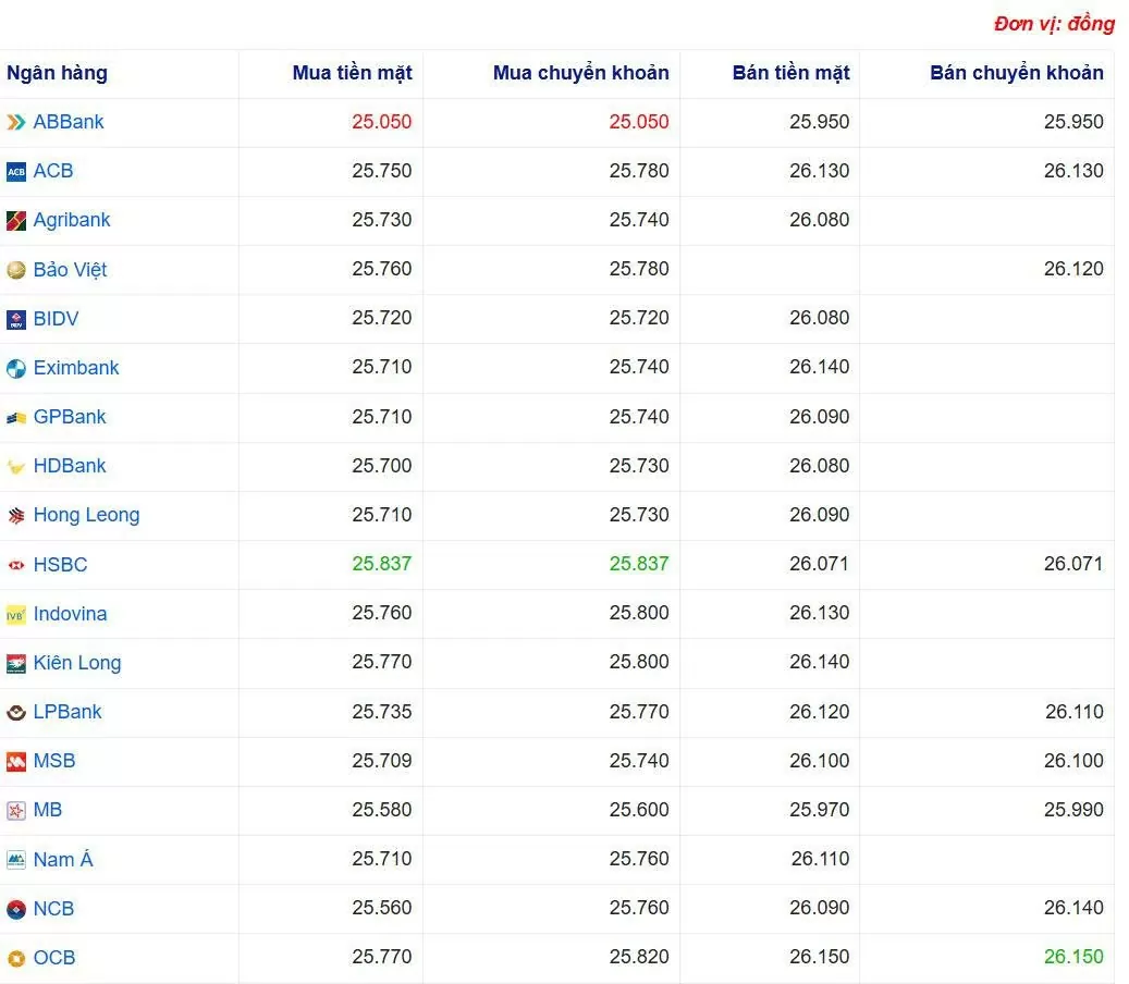 Ngân hàng HSBC đang mua chuyển khoản USD với giá cao nhất là: 1 USD = 25.837 VND