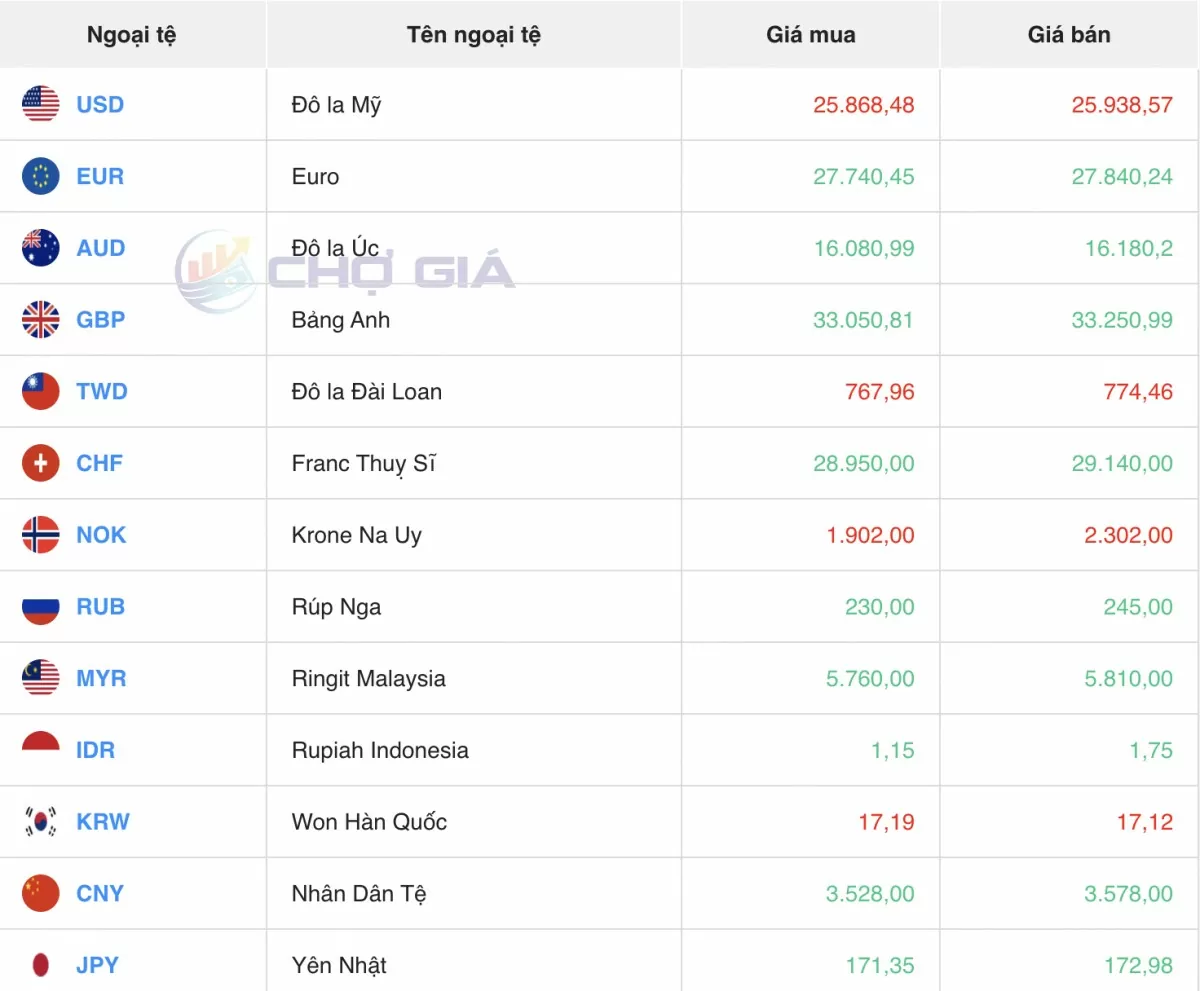 Ghi chú: Tỷ giá mua - bán tiền mặt