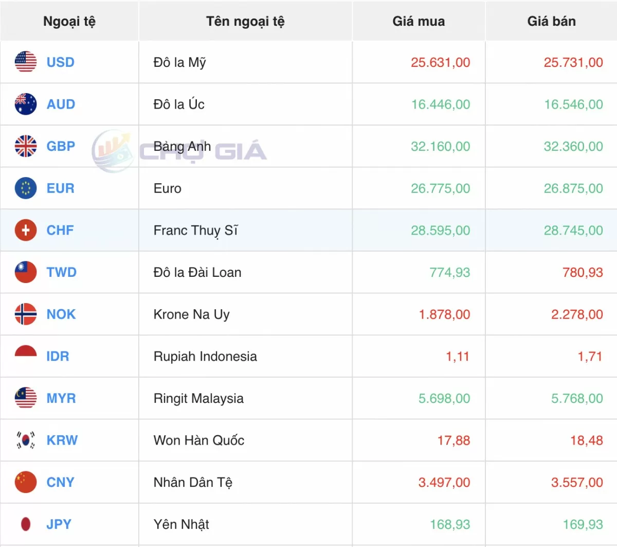 | Franc Thụy Sỹ | CHF | 28,337 | 28,366 | 29,201 |